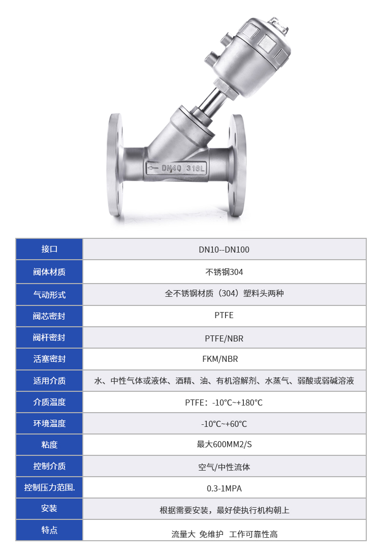 氣動(dòng)形式采用全不銹鋼形式和塑料頭、鋁合金兩種。使用介質(zhì)廣泛:水、中性氣體或液體,酒精,油,有機(jī)溶解劑,水蒸汽,弱堿或者弱酸。