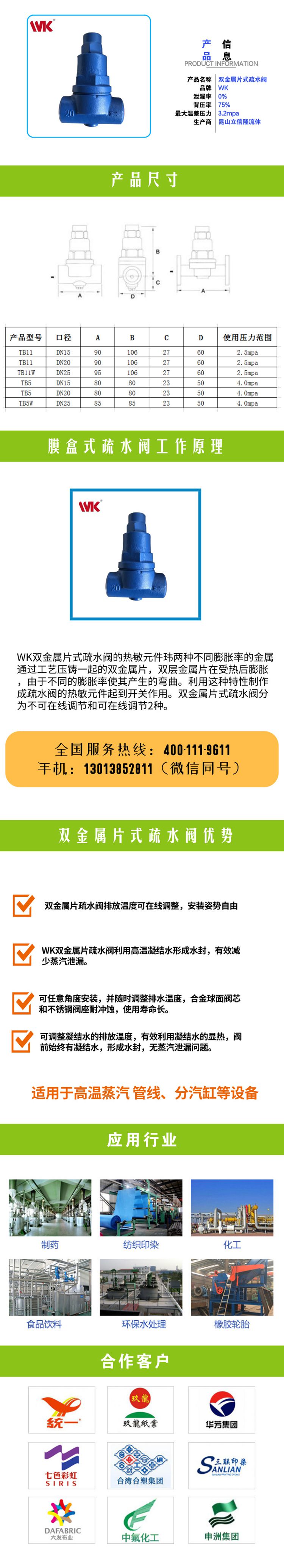 WK雙金屬片式疏水閥的熱敏元件瑋兩種不同膨脹率的金屬通過工藝壓鑄一起的雙金屬片,雙層金屬片在受熱后膨脹,由于不同的膨脹率使其產(chǎn)生的彎曲。利用這種特性制作成疏水閥的熱敏元件起到開關(guān)作用。雙金屬片式疏水閥分為不可在線調(diào)節(jié)和可在線調(diào)節(jié)2種。